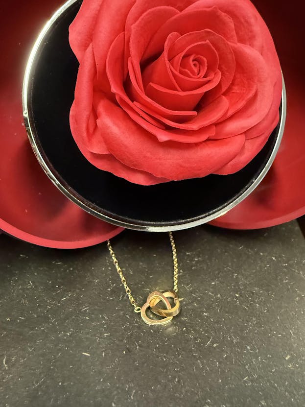 Avec ce collier orné d'une rose éternelle et d'un double cœur gravé, votre amour vous accompagnera toujours. À l'ouverture de l'écrin, vous découvrirez un collier où vos noms sont finement gravés et réalisés en or précieux 18 carats, en or blanc 14 carats ou en or rose 14 carats. Un symbole unique de votre union.